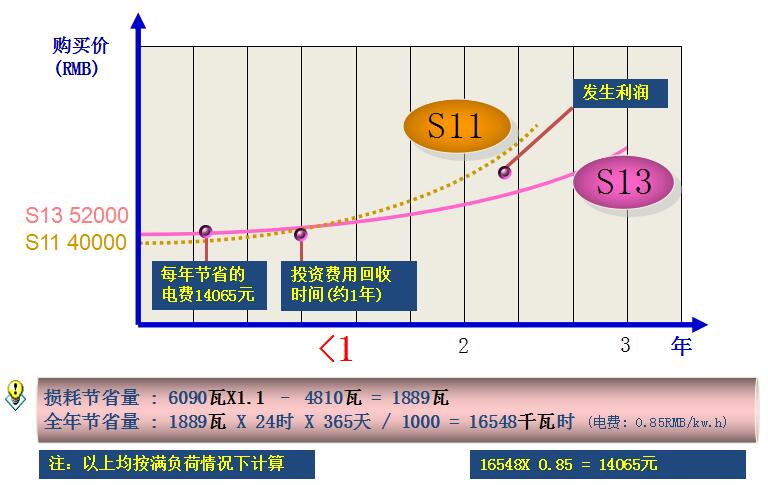 單臺預(yù)計節(jié)能效果 (500kVA) S13I級與S11國標比較